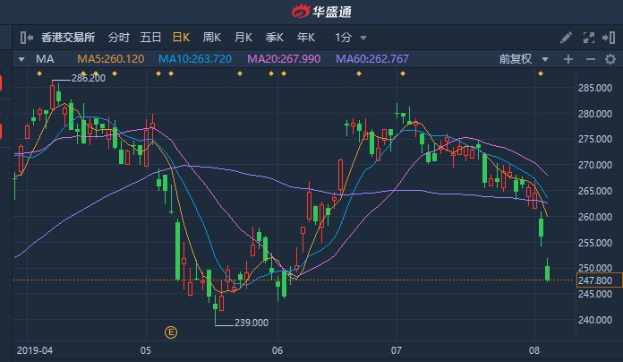 智通财经APP获悉,恒指自7月4日创下阶段性新高以来,接连失守多个整数关口,创下今年二月至今新低。受此影响,港交所(00388)自高位回吐近10%。截至发稿,跌3.2%,报248港元,成交额15.98亿港元。