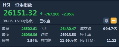 智通财经APP获悉,恒指早盘低开438.11或1.63%,报26480.47点。截至收盘,恒生指数跌767.26点或2.85%,报26151.32点,全日成交额达994.78亿。国企指数跌2.58%,报10081.64点,红筹指数跌2.46%,报4102.22点。