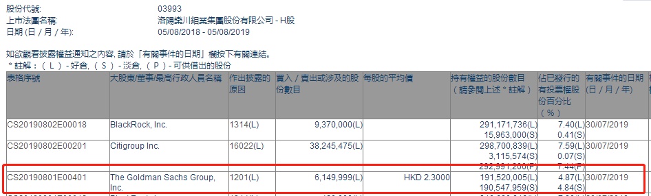 智通财经APP获悉,联交所最新资料显示,7月30日,The Goldman Sachs减持洛阳钼业(03993)615万股,每股作价2.30港元,总值为1414.5万港元,最新持股数目约为1.92亿股,最新持股比例为4.87%。