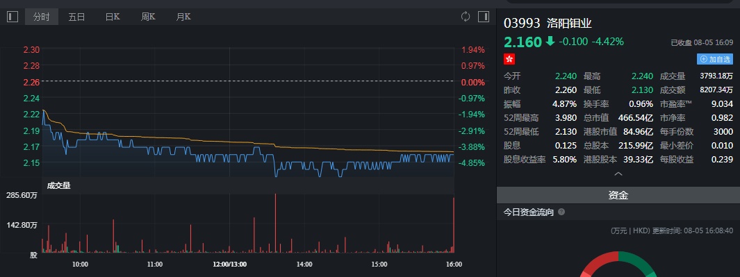截至今日收盘,洛阳钼业(03993)跌4.42%,报2.16港元。