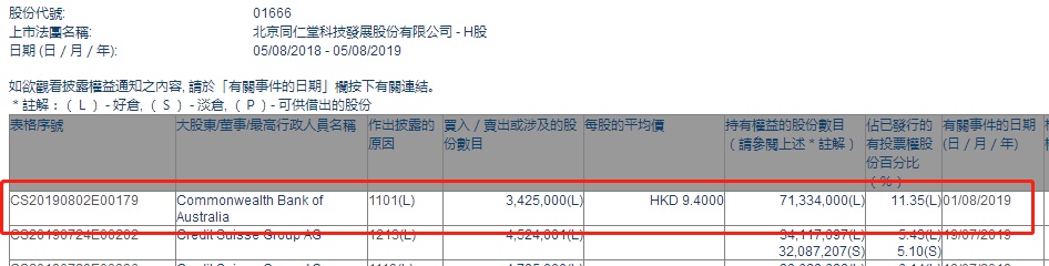 智通财经APP获悉,联交所最新资料显示,8月1日,澳洲联邦银行增持同仁堂科技(01666)342.5万股,每股作价9.40港元,总值为3219.5万港元,最新持股数目为7133.4万股,最新持股比例为11.35%。