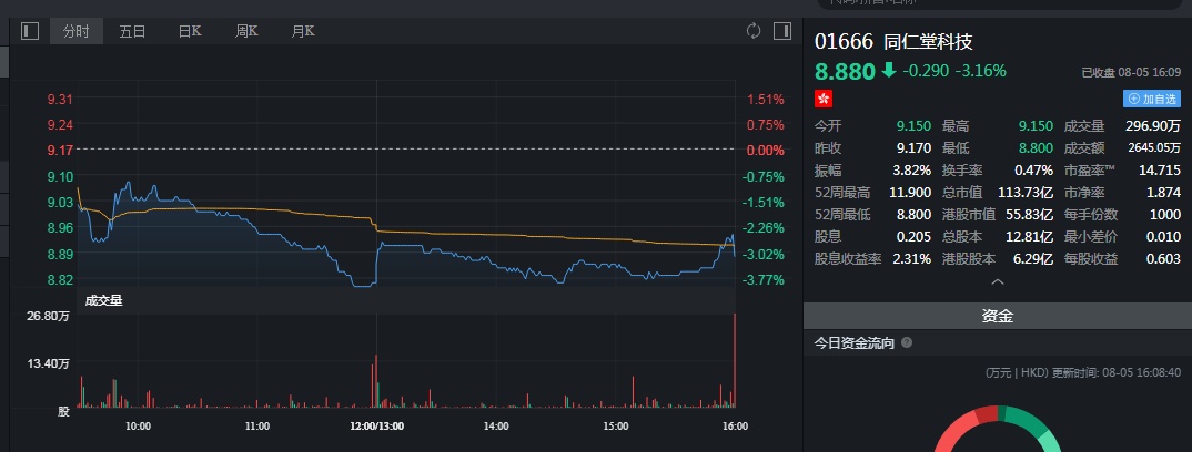 截至今日收盘,同仁堂科技(01666)跌3.16%,报8.88港元。