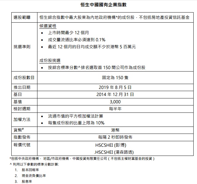 该指数旨在反映最大股东为内地政府机构的香港上市企业之表现。成份股挑选是采用多因子方式,会考虑股票的财务质素、股息率及价格波幅。这项指数是运用经调整的流通市值加权法计算以避免权重过度集中于大型股之上。