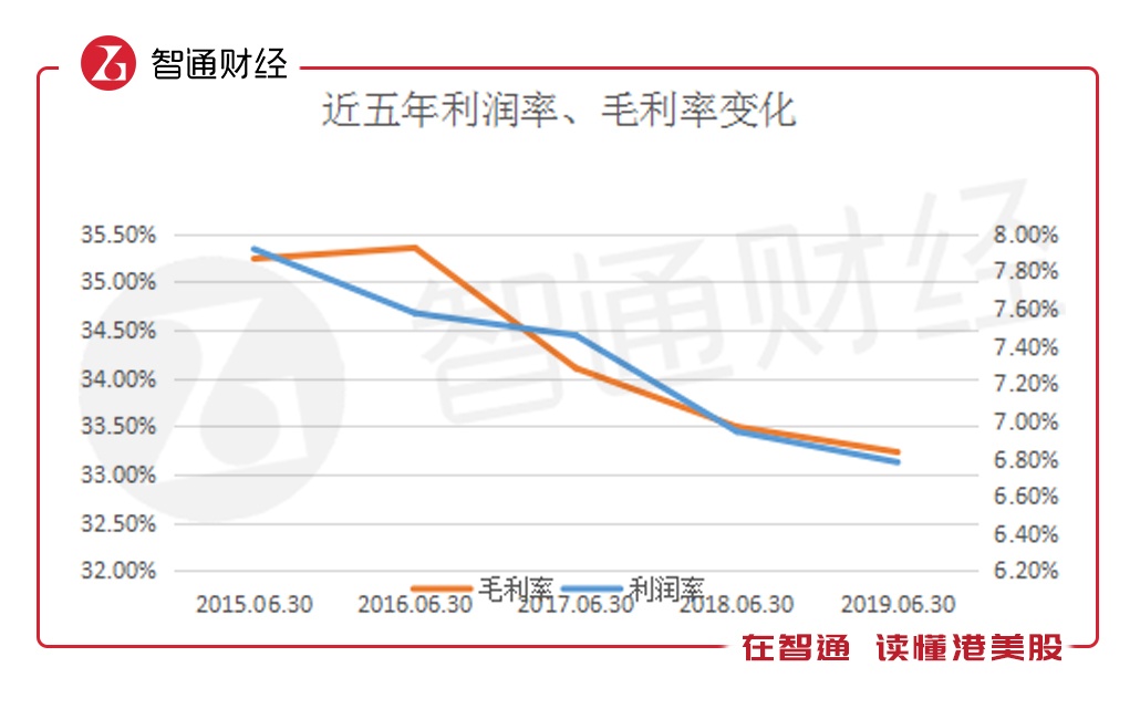 智通财经APP了解到,2015-2019中期五年间,公司毛利率和利润率整体出现了快速下滑。其中,毛利率由2015年中期的35.24%下降至19年同期的33.23%;利润率由2015年中期的7.92%下降至19年同期的6.78%。