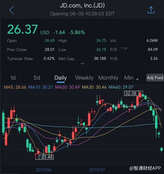 智通财经APP获悉,周一美股盘初,京东(JD.US)跌超5%,报26.48美元。