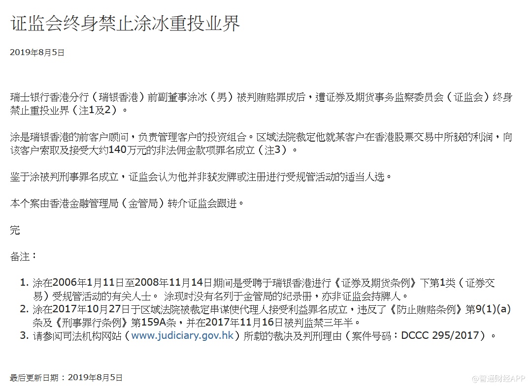 智通财经APP获悉,香港证监会5日消息,瑞士银行香港分行(简称瑞银香港)前副董事涂冰被判贿赂罪成后,遭香港证监会终身禁止重投业界。