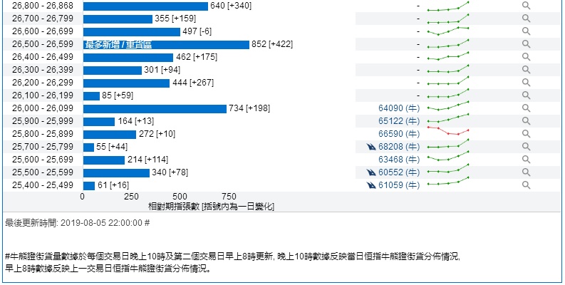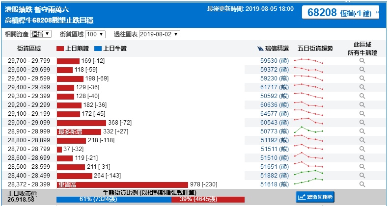 智通财经APP获悉,截至8月5日,恒指最新的牛熊街货比例61:39。瑞信恒指牛熊证街货分布图中的数据显示,熊证街货重货区在28372-28399区间,该区间最新熊证数量为978张,较上一交易日减少230张,最多新增在28900-28999区间。牛证街货重货区在26500-26599区间,该区间最新牛证数量为852张,比上一交易日增加422张;最多新增区间在同一区间。