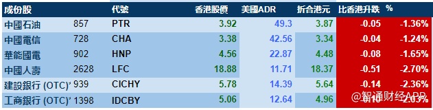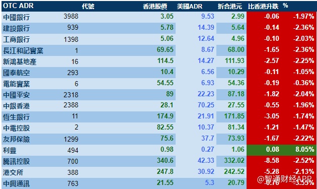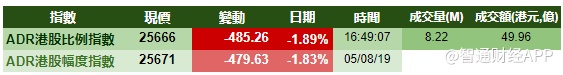 智通财经APP获悉,隔夜港股ADR指数大幅走软,按比例计算,收报25666点,跌485.26点或1.89%。大型蓝筹普跌,汇丰控股收报59.6港元,较港收市跌1.4港元;腾讯控股收报332.02港元,较港收市跌8.58港元。