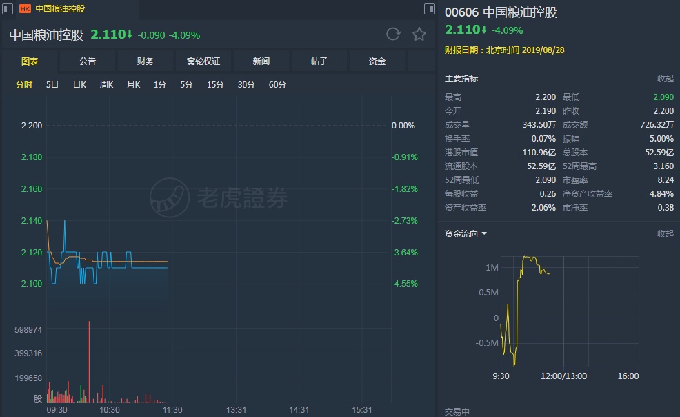 智通财经APP获悉,大摩发布报告指出,中国粮油(00606)股价年初至今跌20%,跑输MSCI中国指数,主要受到非洲猪瘟影响。现价相当于2020年市盈率9倍,并不昂贵,但预计利润短期将进一步收窄,需求及大豆加工利润需要较长时间才能显著复苏,盈利有下行风险。该行将中国粮油目标价由2.3港元降至2港元,给予“减持”评级。