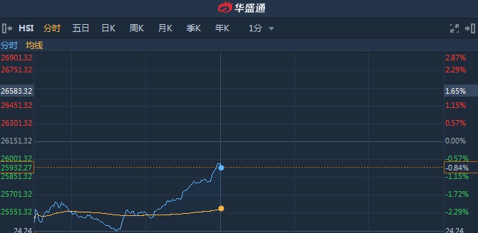 截至13时00分,恒指跌0.85%,报25928.31点,成交额740.5亿。