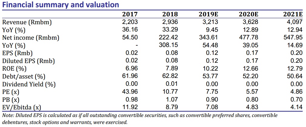 我们将 19 年摊铺每股收益预测从 0.16 元人民币下调至 0.12 元人民币,20 年预测从 0.21 元人民币下调至 0.17 元人民币,21 年预测从 0.24 元人民币下调至 0.20 元人民币。我们将目标价从 1.92 港元下调至 1.45 港元,对应 19 年 10.0 倍市盈率。公司公布二季度经营业绩后股价有所调整,我们相信当前股价已充分反映了市场对利润率的顾虑。鉴于公司运营效率稳步提升、 业绩成长有现金回款支撑,现价距目标价有 61.1%的上涨空间,我们维持公司买入评级。