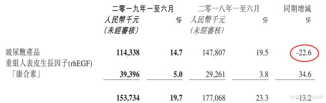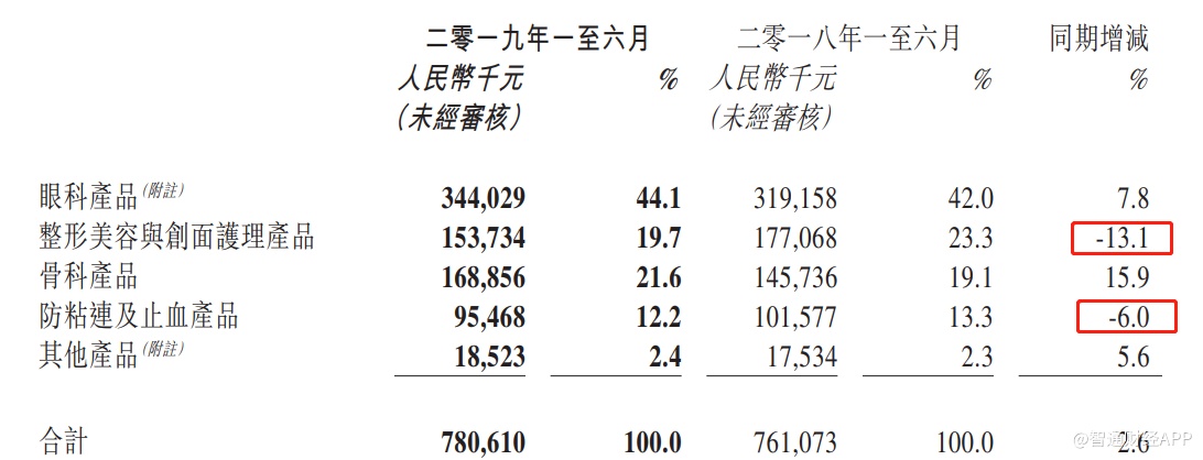 通过数据对比能发现,2018年上半年时,中国内地收入同比增长13.87%,下半年的收入同比增11.89%,全年同比增12.86%。但至2019年上半年时,中国内地的收入虽同比微跌,但增速已大幅下滑。在玻尿酸、防粘连及止血产品低迷之际,中国内地市场收入的下滑或并未触底。