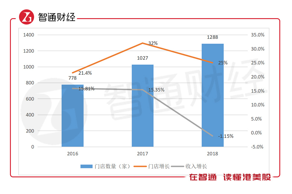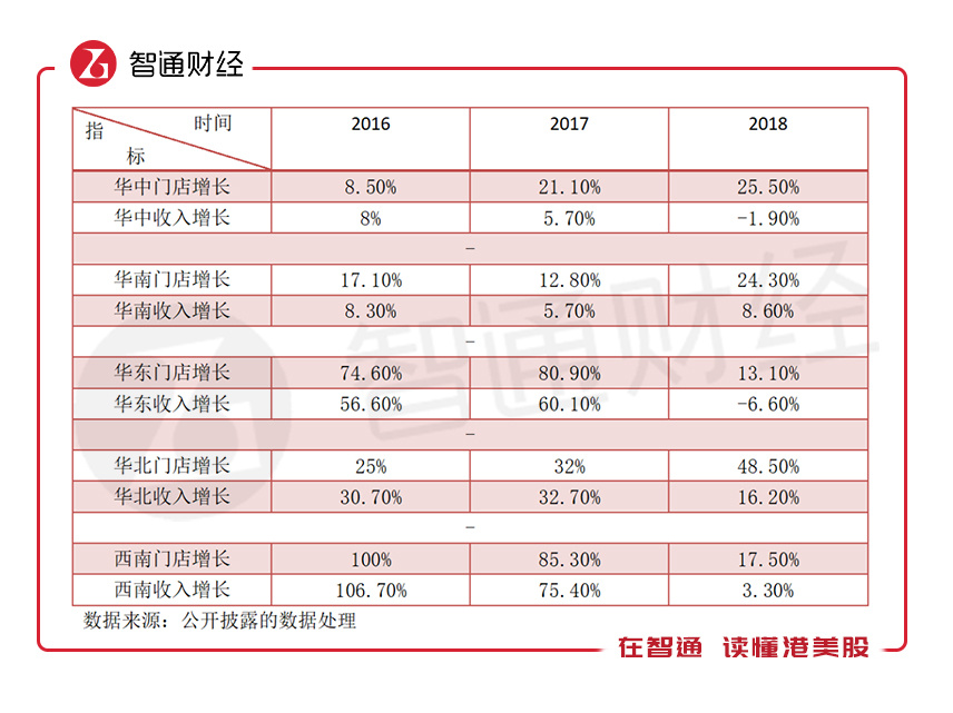从投入效率(门店增长/收入增长)看,各大区域的表现均越来越差,其中华中地区及华南地区在2017年就开始严重背离,而这两个地区的收入占比达75%,严重拖累了整体业绩。投入效率表现较好的是华东、华北以及西南地区,但2018年也出现了“恶化”现象。