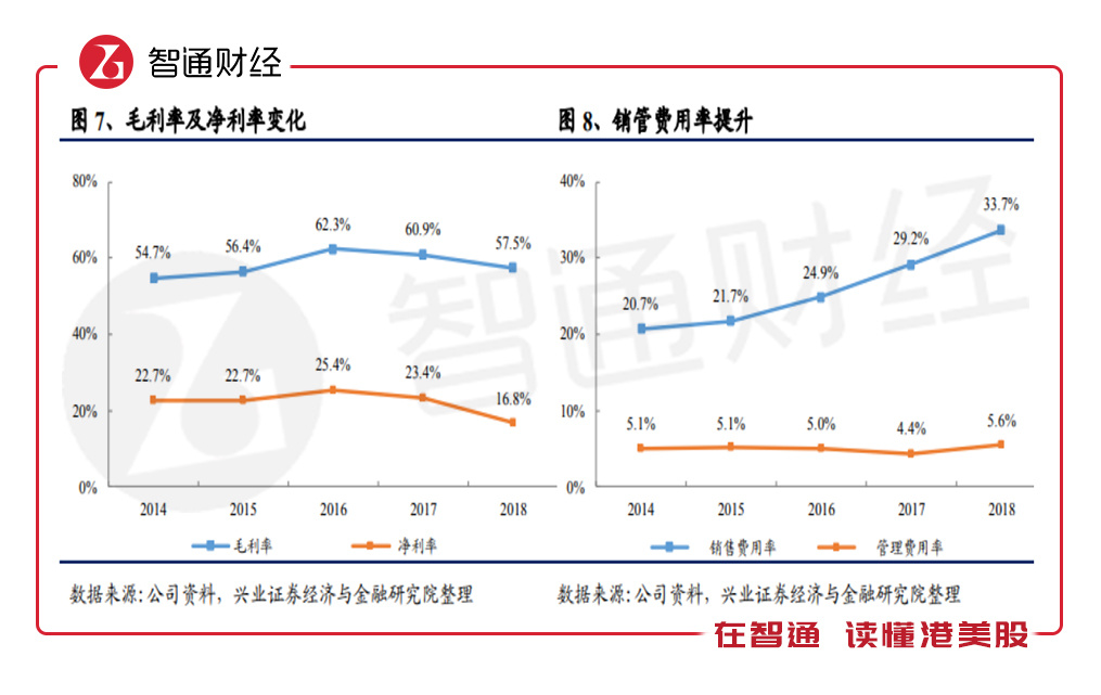 周黑鸭盲目扩张门店导致毛利率、净利率双降。2018年,该公司的毛利率及净利率分别为57.5%和16.8%,较2016年分别下降4.8个百分点和8.6个百分点。该公司的费用率也在逐年提高,特别是销售费用率,2018年为33.7%,较2016年提高了8.8个百分点。