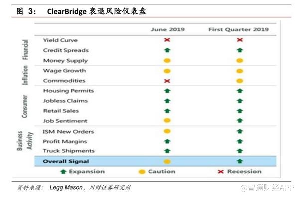 川财证券日前整理了美盛集团(Legg Mason)分析师Jeff Schulze和的观点。根据Jeff Schulze的观点,当前美国经济已经出现预警信号,Clearbridge 衰退风险仪表盘整体已出现黄色预警,其中有关美国经济的两个分项指标(ISM 制造业新订单和就业情绪)也出现了黄色预警。