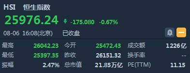 智通财经APP获悉,恒指早盘低开678.89点或2.6%,报25472.43点。盘中一度挫740点,低见25397点,随后跌幅快速收窄,多只蓝筹股由跌转涨。截至收盘,恒生指数跌175.08点或0.67%,报25976.24点,全日成交额达1226.36亿。国企指数跌0.69%,报10012.24点,红筹指数跌0.84%,报4067.66点。