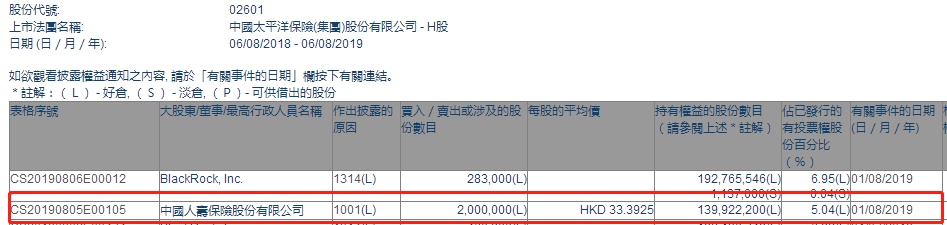 智通财经APP获悉,联交所最新资料显示,8月1日,中国人寿保险增持中国太保(02601)200万股,每股作价33.3925港元,总值为6678.5万港元,最新持股数目为1.40亿股,最新持股比例为5.04%。