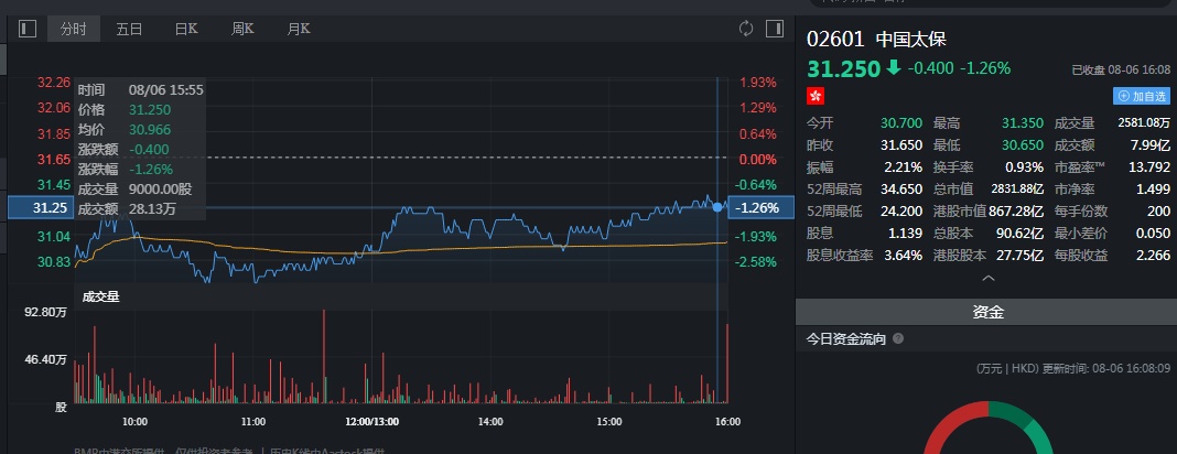 截至今日收盘,中国太保(02601)跌1.26%,报31.25港元。