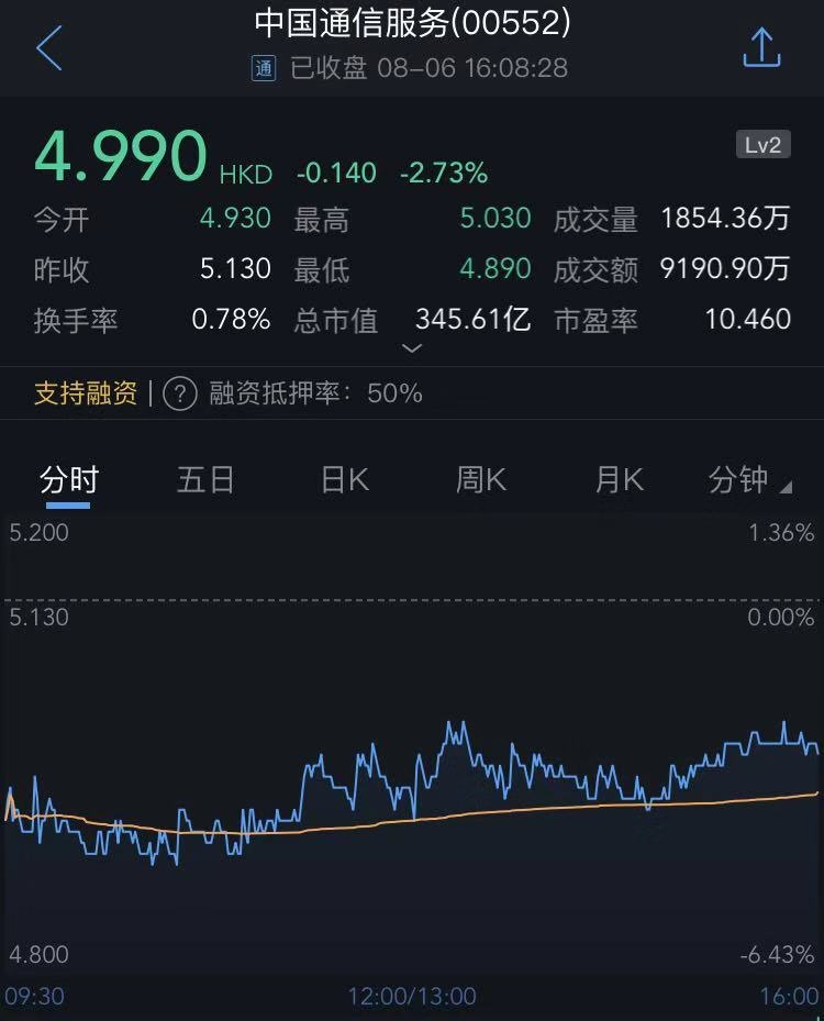 截至今日收盘,中国通信服务(00552)跌2.73%,报4.99港元。