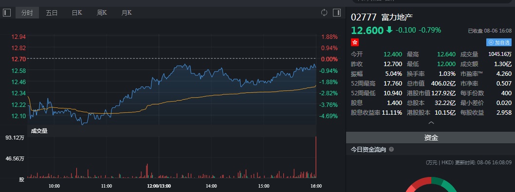 截至今日收盘,富力地产(02777)跌0.79%,报12.60港元。
