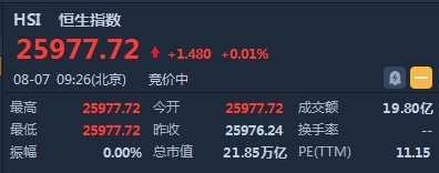 智通财经APP获悉,恒生指数开盘微升0.01%,报25977.72点。国企指数平开,报10011.76点。红筹指数涨0.33%,报4081.14点。大市盘前成交19.8亿港元。隔夜美股反弹,三大股指均收涨逾1%,道指涨超310点。