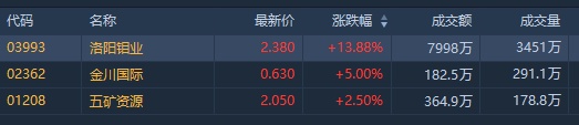 智通财经APP获悉,国内钴价在一年多的弱势行情后,开始出现小幅震荡上涨。截至发稿,洛阳钼业(03993)涨11.96%,报2.34港元,成交额6161.42万港元;金川国际(02362)涨5%,报0.63港元,成交额182.53万港元;五矿资源(01208)涨2.5%,报2.05港元,成交额364.88万港元。
