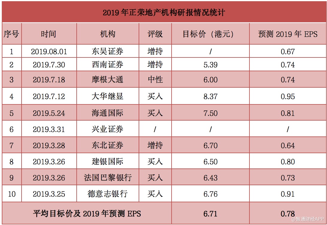 智通财经APP获悉,2019年1月至今,由于正荣地产(06158)稳定的业绩表现和强劲的盈利能力,德意志银行、法国巴黎银行、建银国际、东北证券、兴业证券、海通国际、大华继显、摩根大通、西南证券、东吴证券10家机构先后发布研报覆盖正荣地产,对正荣地产前景表示看好,机构给出的平均目标价为6.71港元。