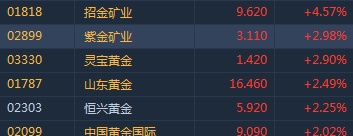 智通财经APP获悉,COMEX期金盘中快速攀升,逼近1500美元关口。港股黄金股全线走强,截至9时56分,招金矿业(01818)涨4.57%,报价9.62港元,紫金矿业(02899)涨2.98%,山东黄金(01787)涨2.49%。
