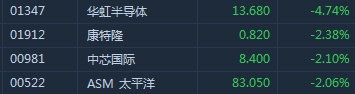截至10时38分,华虹半导体(01347)跌4.74%,报价13.68港元,康特隆(01912)跌2.38%,中芯国际(00981)跌2.1%,ASM太平洋(00522)跌2.06%。