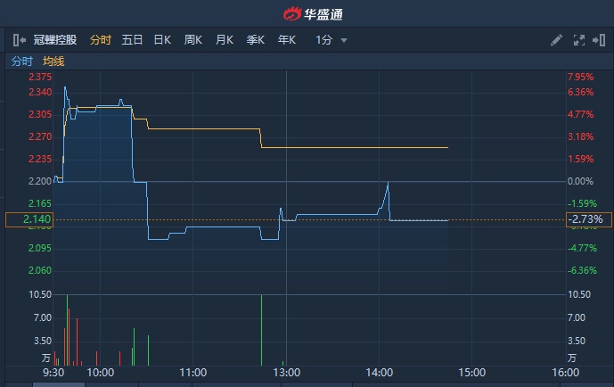 智通财经APP获悉,冠轈控股(01872)昨日发布盈警,预期集团2019年上半年公司权益持有人应占溢利将同比减少不少于60%。截至发稿,跌2.73%,报2.14港元,成交额145.3万港元。