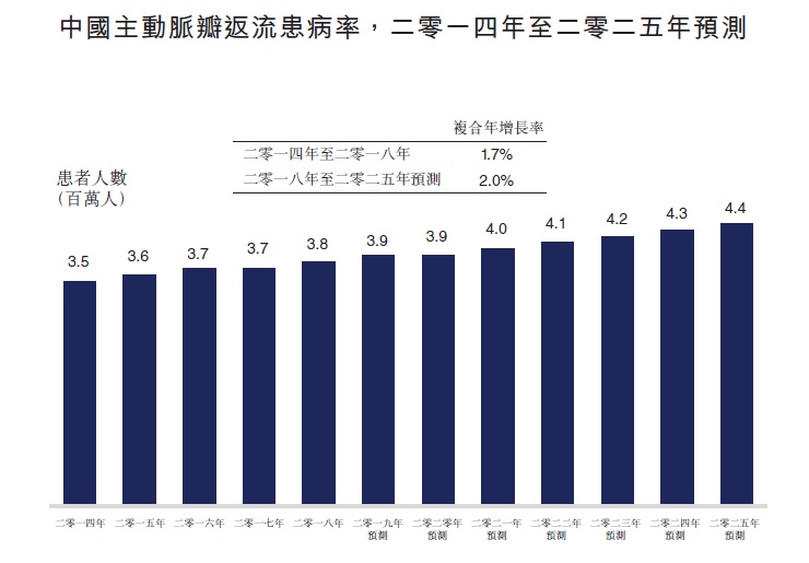 具体而言,主动脉瓣疾病影响的全球患者人口达到4530万,预期于2025年升至5190万,而中国患主动脉瓣狭窄的患者人数由2014年的390万人增加至2018年的420万人,且预期于2015年将增加至490万人;主动脉瓣返流患者数目由2014年的350万人增加至2018年的380万人,预计2025年达440万人。