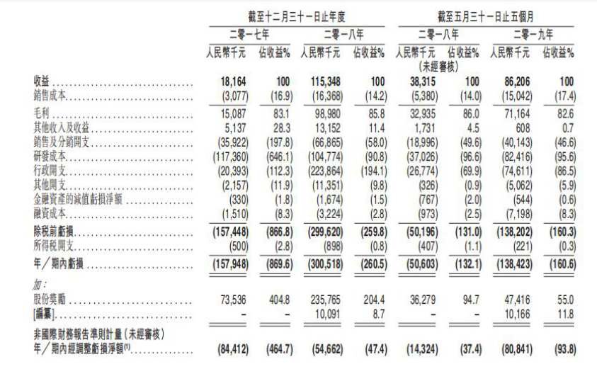 按照非国际财务报告准则计量(未经审核),该公司2017、2018年经调整亏损净额分别为0.84亿元、0.55亿元,2018年前五个月、2019年前五个月经调整亏损净额为0.14亿元、0.81亿元。