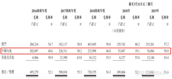然而,据公司招股书显示,公司收入来源占比最大的地区为澳门,于2019年3月31日占比答57.5%。相比之下,内地占比仅为37%。在公司列示的零售店铺于各地区的收入明细中,内地地区占比更低,占比35.8%,其中广东省为公司内地收入来源最大的地区,占比达24%,澳门地区则为58.5%。截至2019年,公司按地区划分的毛利率由高到低依次为澳门地区、香港及其他地区、内地,其中内地为公司毛利率最低的地区。