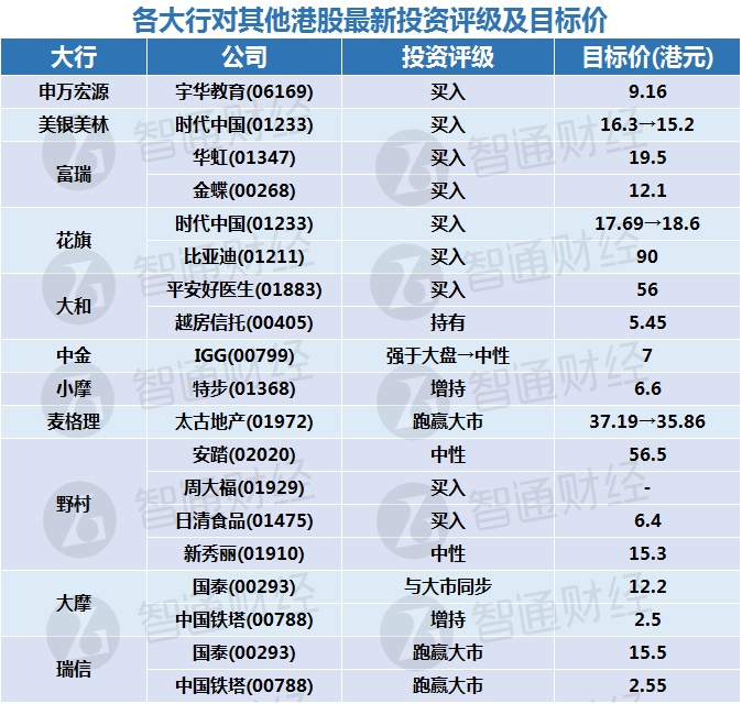 一,各大行对中电(00002)最新投资评级及目标价:二,各大行对统一(00220)最新投资评级及目标价:三,各大行对九龙仓置业(01997)最新投资评级及目标价:四,各大行对其他港股最新投资评级及目标价: