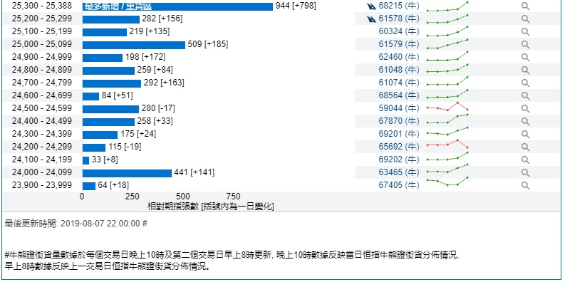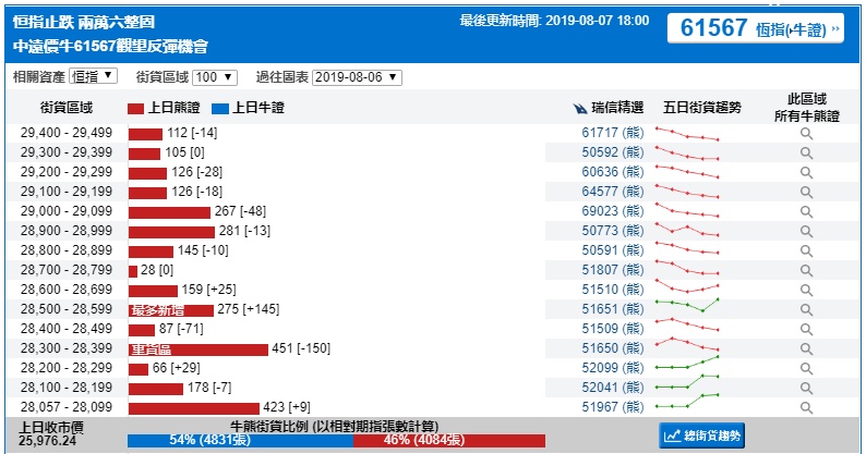 智通财经APP获悉,截至8月7日,恒指最新的牛熊街货比例54:46。瑞信恒指牛熊证街货分布图中的数据显示,熊证街货重货区在28300-28399区间,该区间最新熊证数量为451张,较上一交易日减少150张,最多新增在28500-28599区间。牛证街货重货区在25300-25388区间,该区间最新牛证数量为944张,比上一交易日增加798张;最多新增区间在同一区间。