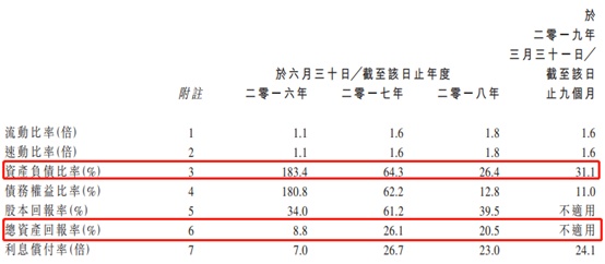 资产负债比率于2016年、2017年及2018年6月30日以及2019年3月31日,该公司分别录得资产负债比率约183.4%、64.3%、26.4%及31.1%。于2019年3月31日,资产负债比率上升至31.1%,是因为应付董事款项增加导致负债总额增加所致。