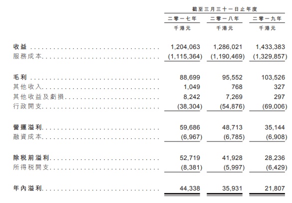 根据招股书数据,企业截止2017年、2018年及2019年3月31日止收入分别约为12.041亿港元、12.86亿港元及14.33亿港元。于相应年度╱期间,毛利分别约为8869.9万港元、9555.2万港元、1.035亿港元。