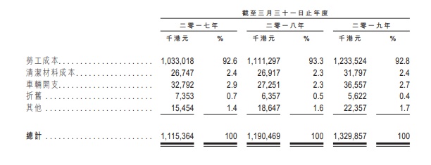 由于业务是属劳动密集型,劳工成本(主要包括薪金及其他劳工福利、强积金供款、雇员福利拨备以及人力资源供应商成本)为我们服务成本的最大部分, 截至2017年、2018年及2019年 3月 31日止年度分别占服务成本总额约92.6%、93.3%及92.8%。