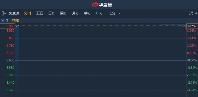 智通财经APP获悉,小米集团-W(01810)多重利好助力,早盘高开后股价强势上扬,截至9时37分,涨3.82%,报价8.98港元,成交额1.544亿。