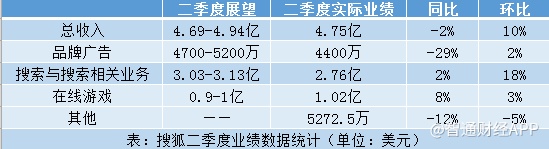 早在一季度发布业绩之时,搜狐就对二季度的业绩做了详细指引。智通财经APP发现,虽然搜狐二季度以4.75亿美元的总收入位于指引的中位区间内,同比跌2%,环比增10%,但各业务的实际收入却与指引有很大差距。