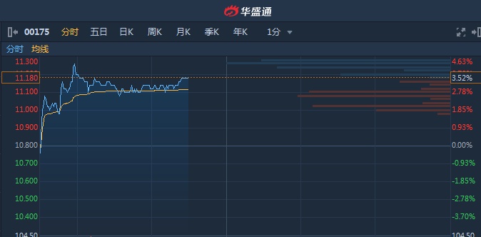 智通财经APP获悉,吉利汽车(00175)7月出口量同比增59%至3989部,消息助力股价上扬。截至11时28分,涨3.52%,报价11.18港元,成交额2.27亿。