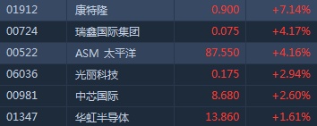 智通财经APP获悉,芯片板块随A股集体走高,ASM太平洋(00522)涨超4%,截至14时24分,康特隆(01912)涨7.14%,报价0.9港元,ASM太平洋(00522)涨4.16%,中芯国际(00981)涨2.6%,华虹半导体(01347)涨1.61%。