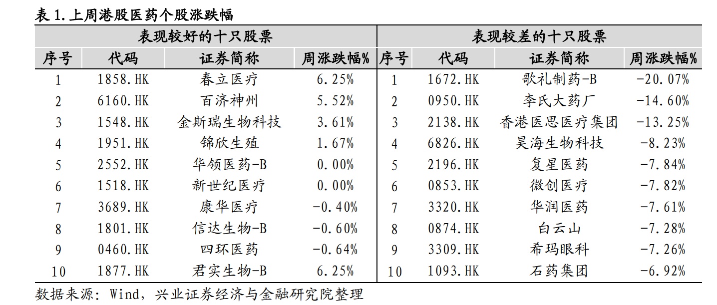 近期个股行情:在过去的一个交易周内,涨幅前三的个股分别为春立医疗(01858)、百济神州(06160)、金斯瑞生物科技(01548),分别呈现 6.25%、5.52%、3.61%的涨幅;本周末市值前三的翰森制药(03692)、药明康德(02359)、中国生物制药分别为-4.59%、2.76%和 3.39%,本周跌幅最大的个股为歌礼制药-B,下跌-20.07%。