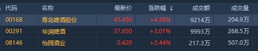智通财经APP获悉,A股啤酒板块早盘放量拉升,带动港股酒业个股走强。截至发稿,青岛啤酒股份(00168)涨4.13%,报45.35港元,成交额8995.8万港元;华润啤酒(00291)涨2.87%,报37.6港元,成交额9903.05万港元;怡园啤酒(08146)涨2.44%,报0.42港元,成交额217.25万港元。