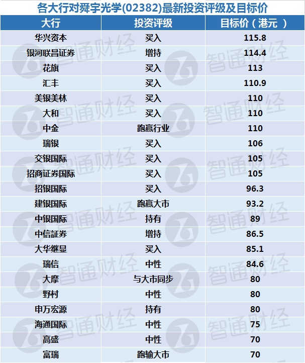 二,各大行对舜宇光学(02382)最新投资评级及目标价: