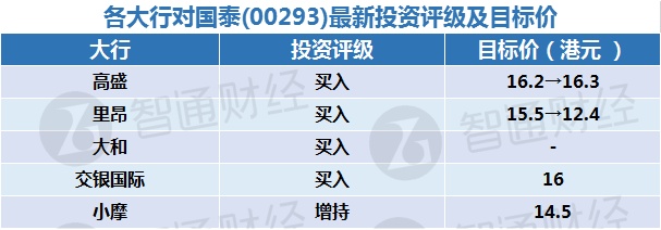 四,各大行对国泰(00293)最新投资评级及目标价: