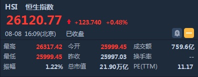 智通财经APP获悉,恒指早盘高开0.01%,报25999.45点。截至收盘,恒生指数涨123.74点或0.48%,报26120.77点,全日成交额达759.61亿。国企指数涨0.48%,报10041.62点,红筹指数涨0.83%,报4117.06点。