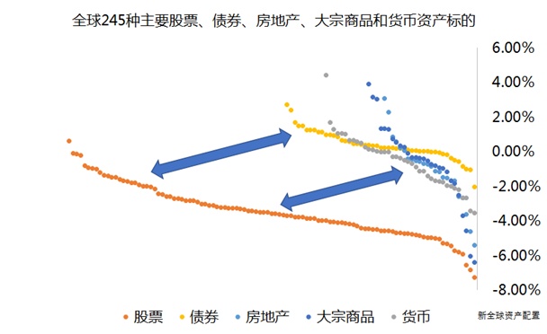 在我们的245种全球资产标的中,股票类资产几乎全部下跌。房地产、大宗商品和货币资产的价格,也受到牵连,均有不少比例的下挫。动荡的机会难得,我们怎么能放过呢?