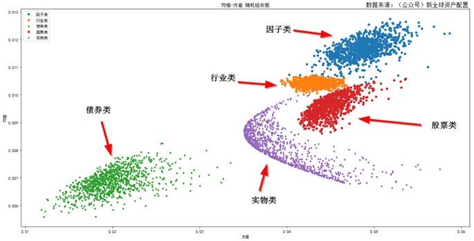 我们在每一类标的中,一共进行了1000次的随机组合,然后在均值(纵轴)-方差(横轴)图中画出了所有的随机组合。从上图中可以看出,股票类和因子类资产,跟债券类资产有明显的属性上的区别。