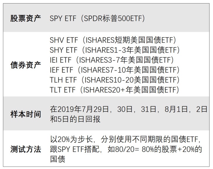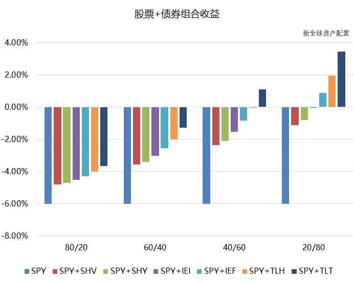 具体来讲,假如我们使用经典的60/40组合,即配置60%股票+40%国债ETF。以短期国债SHV作为国债的投资标的,该投资组合在暴跌期间的亏损能从6.02%减少到3.58%。而如果我们的债券部分投资的是更长期的IEF(7-10年美国国债ETF),甚至是TLT(20+年美国国债ETF),投资组合的亏损能减少到2.57%和1.28%。